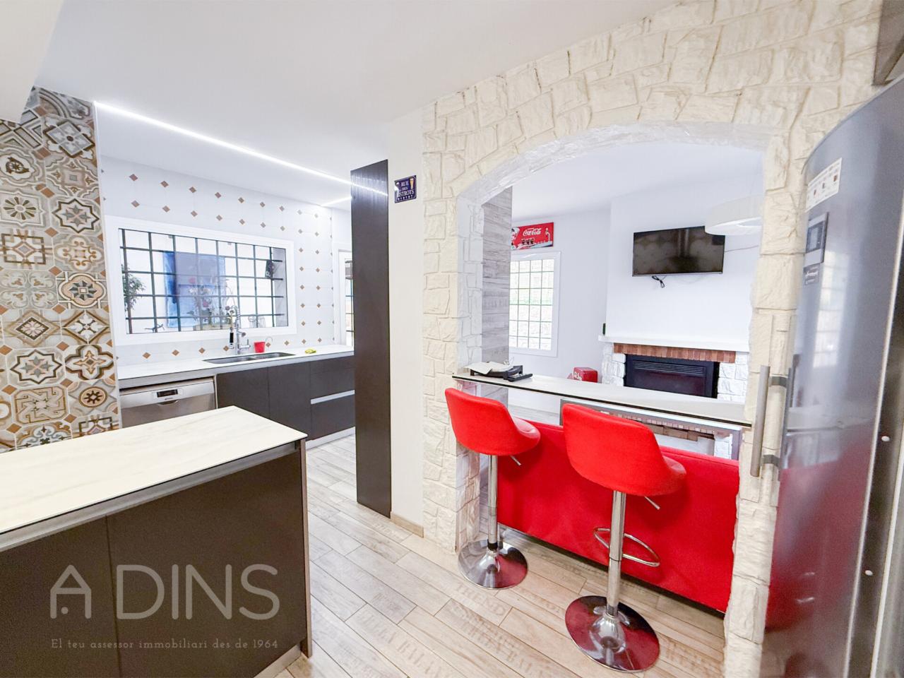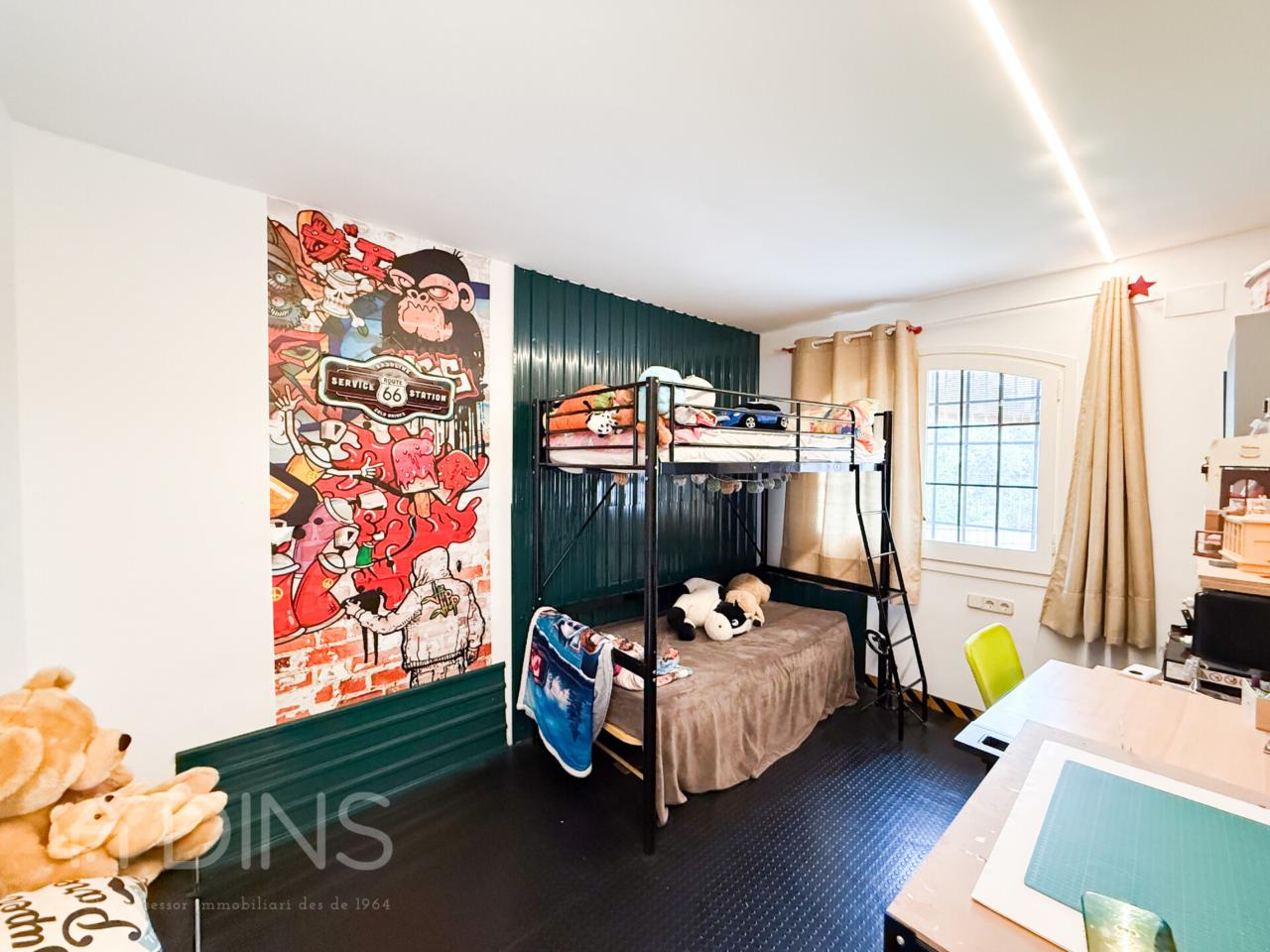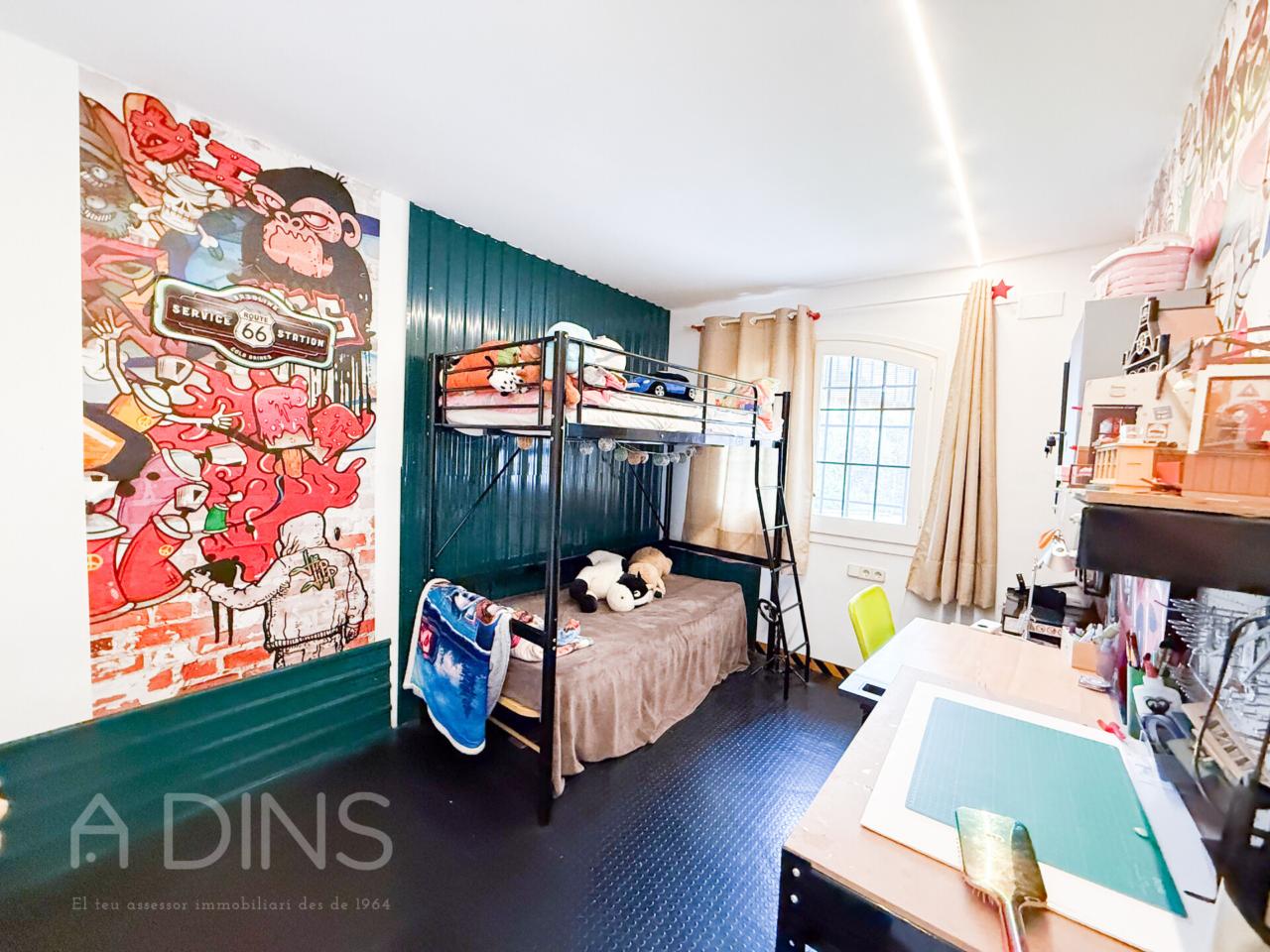 L’habitatge, construït l’any 1989 i parcialment actualitzat el 2024, es distribueix en dues plantes. A la planta principal trobem tres dormitoris (un d’ells tipus suite amb bany privat), un bany complet addicional, una cuina office reformada amb xemeneia i sortida directa al jardí i al menjador d’estiu, un ampli saló-menjador amb molta llum natural i una altra xemeneia, així com un pràctic safareig independent.